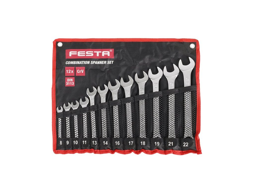 Sada očkoplochých klíčů FESTA je včetně organizéru, sešitého z velmi odolné a pevné tkaniny s oky pro zavěšení. Nástrčné očkoploché klíče jsou vyrobeny kováním z kvalitní chromvanadiové oceli. Tato ocel je zušlechtěná na požadované vlastnosti a povrchově upravená matným tvrdochromem pro dosažení optimální povrchové tvrdosti a odolnosti vůči korozivním vlivům. Kvalitou, tvrdostí a přesností přesně odpovídají normě DIN3113.