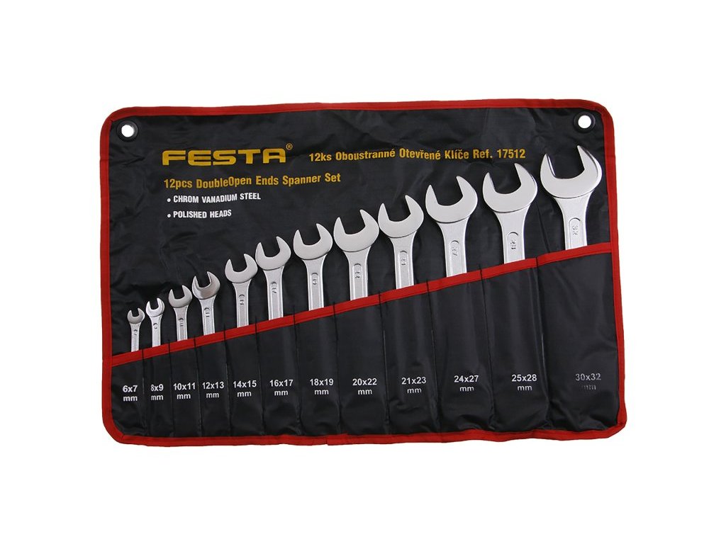 Sada otevřených klíčů FESTA je včetně organizéru, sešitého z velmi odolné a pevné tkaniny s oky pro zavěšení. Nástrčné ploché klíče jsou vyrobeny kováním z kvalitní chromvanadiové oceli. Tato ocel je zušlechtěná na požadované vlastnosti a povrchově upravená matným tvrdochromem pro dosažení optimální povrchové tvrdosti a odolnosti vůči korozivním vlivům. Kvalitou, tvrdostí a přesností přesně odpovídají normě DIN3110.