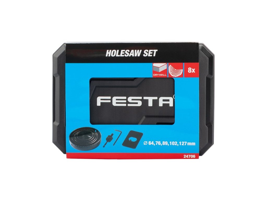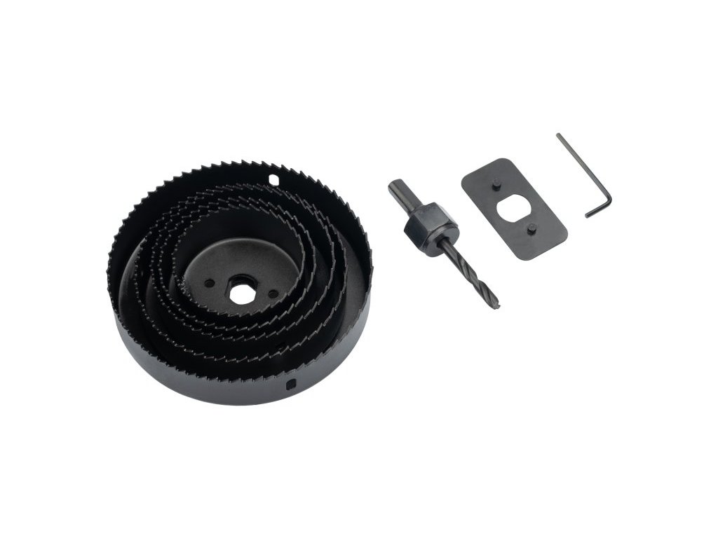 Sada vykružovacích pil 8ks do dřeva a sádrokartonu, průměr: 64,76,89,102,127 mm, inbus+hlavička. Instruktážní video