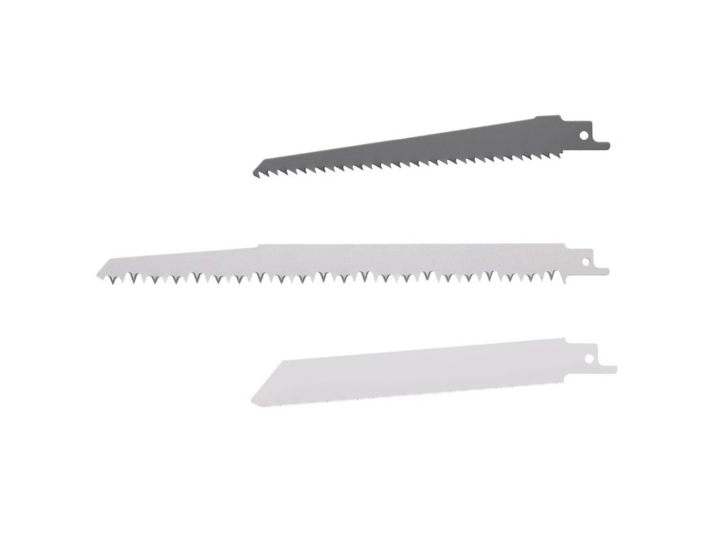 praktická sada plátků pilových na kovy, dřevo, plasty do elektrické pily ocasky, 3 kusy od typu HCS - vysokouhlíková ocel, Bi - Metal - materiál odolávající většímu tepelnému zatížení, delší životnost ostří plátku doporučená maximální tloušťka řezu - plechy 3 - 5 mm, kovové profily a trubky 80 mm, dřevo 80 - 200 mm rozměry : BiM - 150 x 19 x 1 mm, počet zubů na palec (TPI) - 24 HCS - 150 x 19 x 1.3 mm, počet zubů na palec (TPI) - 6 HCS - 240 x 19 x 1.5 mm, počet zubů na palec (TPI) - 5 Instruktážní video