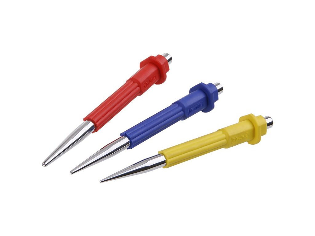 Kvalitní sada průbojníků FESTA z chrom vanadové oceli s gumovou rukojetí pro pohodlnou práci. Průměr hrotu 0,8, 1,5, 2,5 mm.