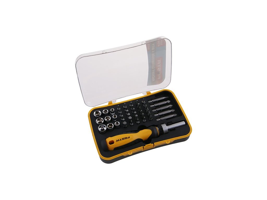 sada ráčnový šroubovák s bity 45ks komponenty z kvalitní CrV oceli dřík - šestihran 1/4" s magnetem ergonomická dvoukomponentní rukojeť, neklouzavý a pevný úchop obsah sady : ráčnový šroubovák (18325 - samostatné provedení) 5 * bit 1/4" * 50 mm S 5, PH 1,2 a PZ 1,2 30 * bit 1/4" * 25 mm S 3, 4, 5, 6, 7 PH 1, 2, 3, PZ 1, 2, 3 T 10, 15, 20, 25, 27, 30, H 2, 2.5, 3, 4, 5, 6 SQ 2*0, 2*1, 2, 2*adapter bit-čtyřhran 1/4" pro hlavice hlavice 1/4" 5, 6, 7, 8, 9, 10, 11, 12, 13