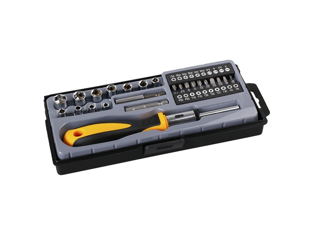 sada bitů a nástavců 36 ks kvalitní chromvanadiová ocel ergonomická rukojeť s ráčnou pro snadnou práci, dřík 1/4" s magnetem