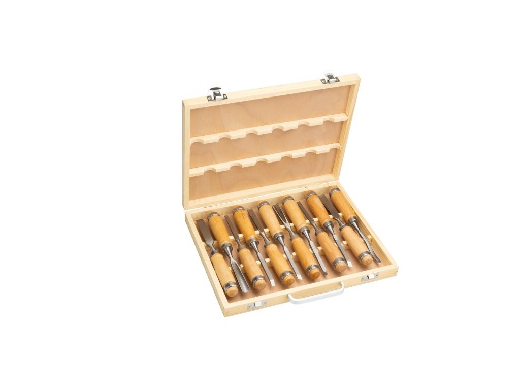Dláta řezbářská 12 ks v sadě. Dláta prodávaná v dřevěnném kufříku. Různé