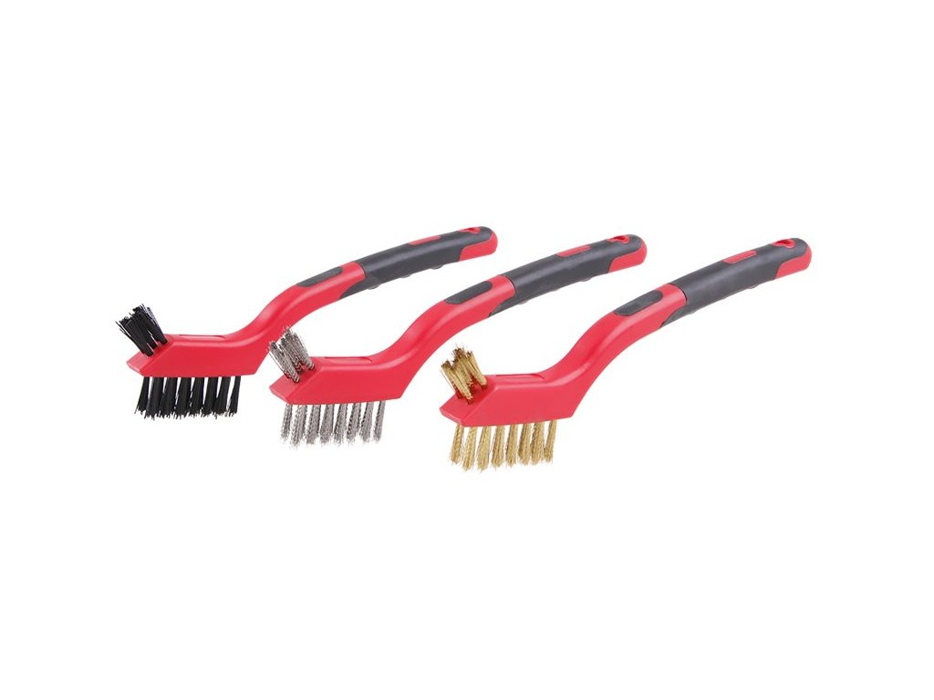Sada tří kusů ručních kartáčů - tělo kartáče z polypropylenu a TPR gumy , Nylon, nerez, mosaz. Délka 180 mm.