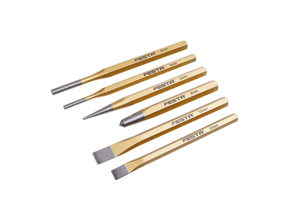 Sada sekáčů, dulčíků a průbojníků FESTA vyrobena z chrom vanadové oceli. Sada obsahuje 6 ks dulčík: 2x140, 8x115mm, sekáč: 12x152, 10x142 , průbojník: 3x152, 6x152 .