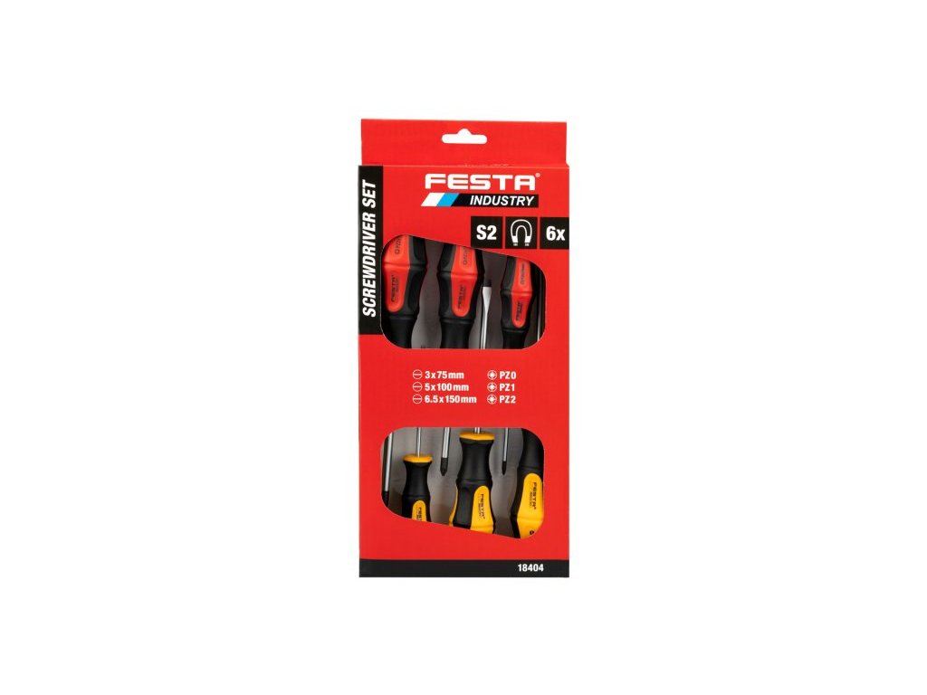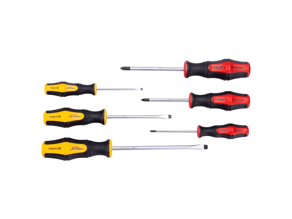 profesionální šroubováky určené pro průmyslové použití dřík vyroben z oceli S2 - ocel zušlechtěná legovacími prvky - chrom, křemík, mangan, molybden, vanadium magnetická kalená špička ergonomická zdravotně nezávadná dvoukomponentní rukojeť - neklouzavý a pohodlný úchop, otvor pro páku obsah sady - ploché 3x75, 5x100, 6x150 - PZ 0, 1, 2 typ a rozměry uvedeny v názvu výrobku