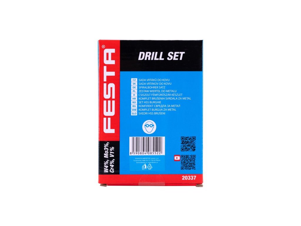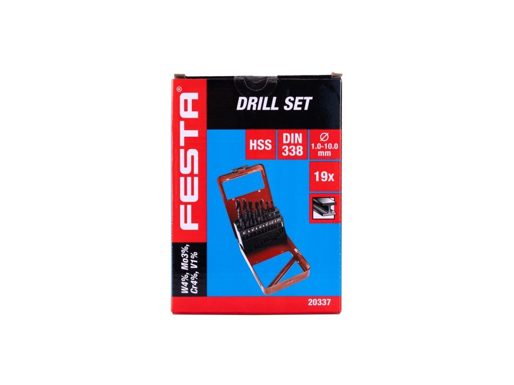 Sada vrtáků do kovu HSS, splňující normu DIN 338, vrtáky jsou vyrobené z vysoce kvalitní rychlořezné oceli (HSS), Wolfram 4%, Molybden 3%, Chrom 4%, Vanadium 1%. V sadě 19 ks, průměr 1,0 - 10,0 mm.