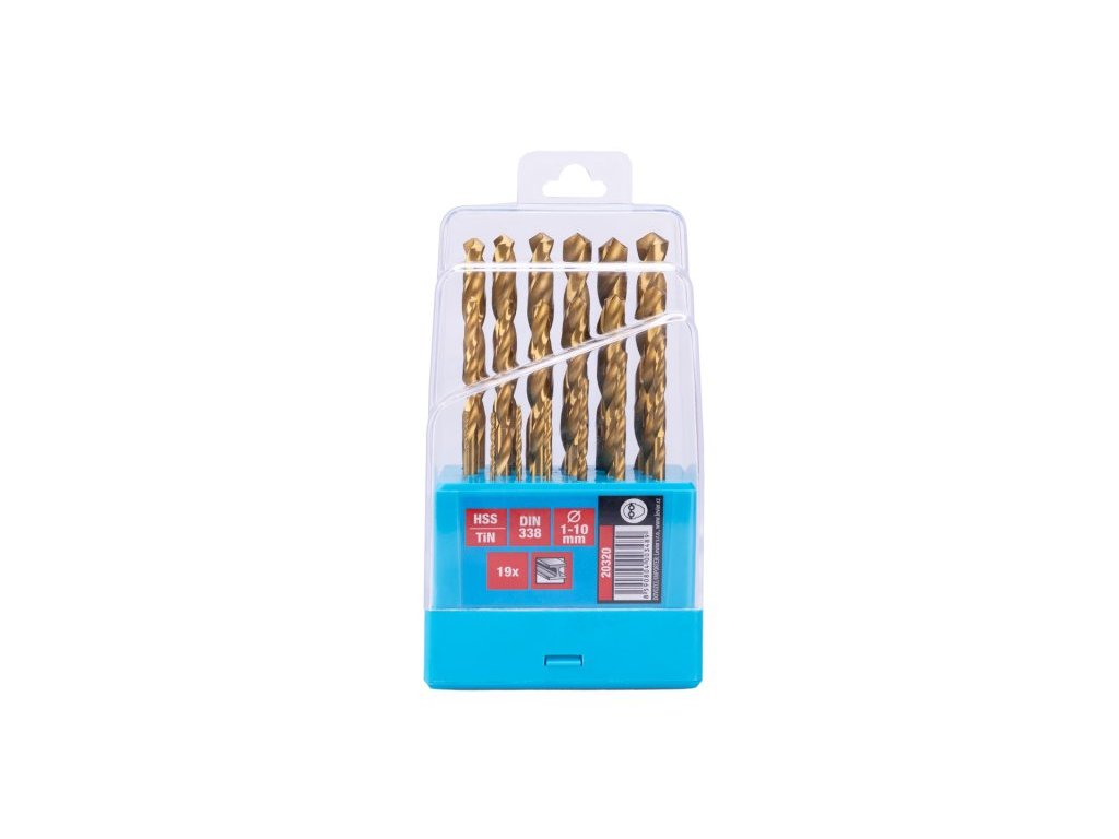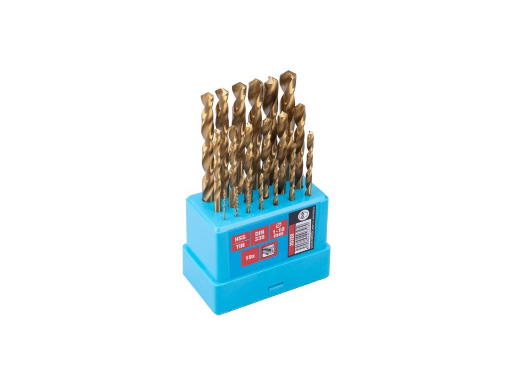 Sada vrtáků HSS DIN 338, RN s ochrannou vrstvou TiN proti otěru, je vyrobená z kvalitní rychlořezné oceli (HSS). Přesné vyrobená šroubovice pro kvalitní výkon, přesnost a dobré středění, vybroušení úhlu špičky vrtáku 118°, pro vrtání běžné konstrukční oceli, baleno v PVC krabičce.