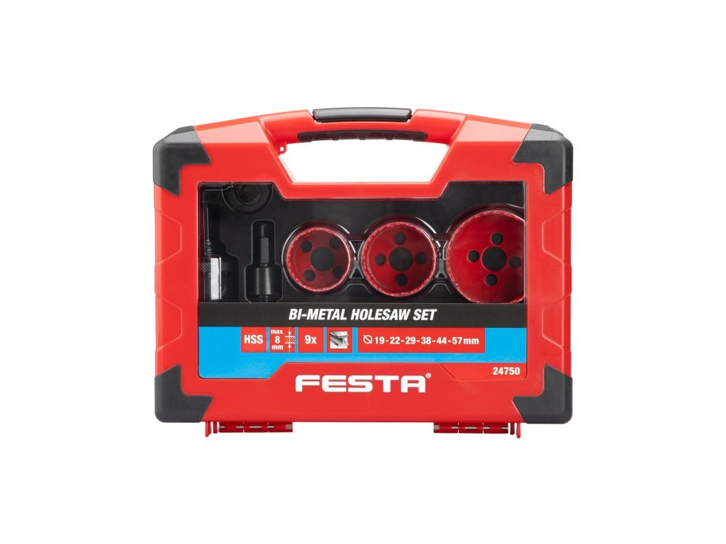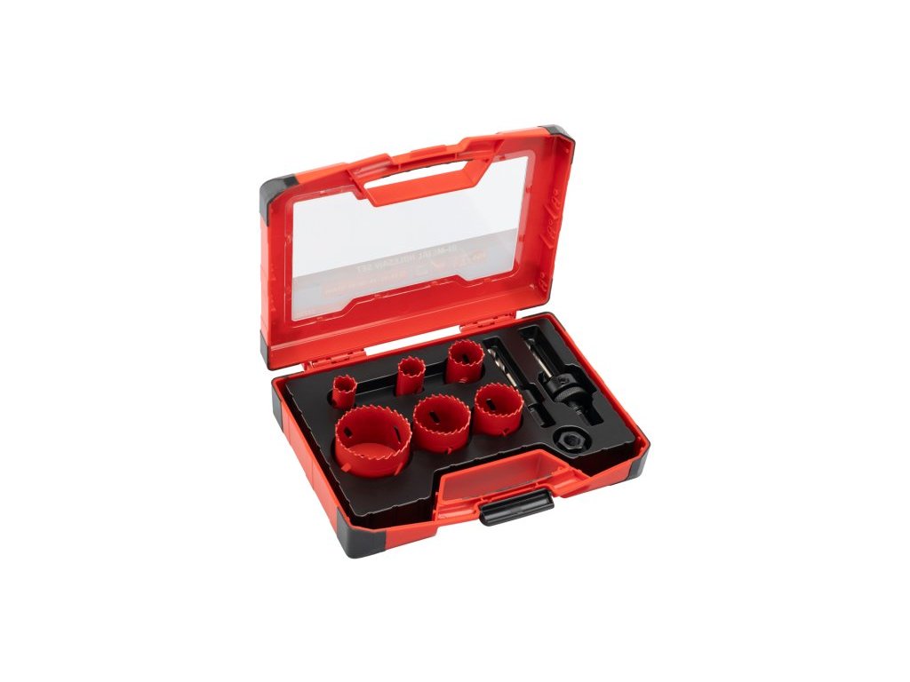 sada korunek vrtacích - vykružovacích HSS BiM průměry: 19, 22, 29, 38, 44, 57 mm pro vrtání - vykružování kruhových otvorů do oceli, barevných kovů, sádrokartonu, dřeva, plastů apod. náhradní unašeče 24410, 24411 Instruktážní video