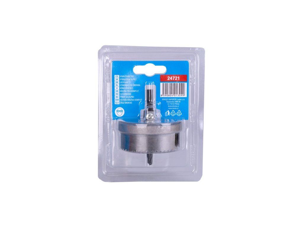 Sada vykružovacích pil do dřeva, sádrokartonu, dřevotřísek apod., s upevněním do vrtačky. Sada obsahuje 7 kusů pil o průměrech 26, 32, 38, 45, 50, 56 a 63 mm.