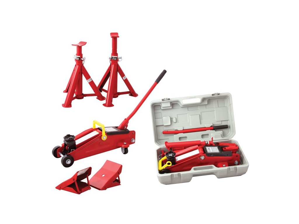 POJÍZDNÝ ZVEDÁK - Nosnost 2t. Min. výška 130 mm, max. výška 345 mm. Hmotnost 9,6 kg. PODPĚRY 2ks - Nosnost 2 t. Min. výška 277 mm, max. výška 365 mm. Sada zvedáku + 2 kusů stavitelných podpěr + 2 kusů klínů pod kola pro zajištění stability. Dodáváno v plastovém kufru pro snadné přenášení a uložení.