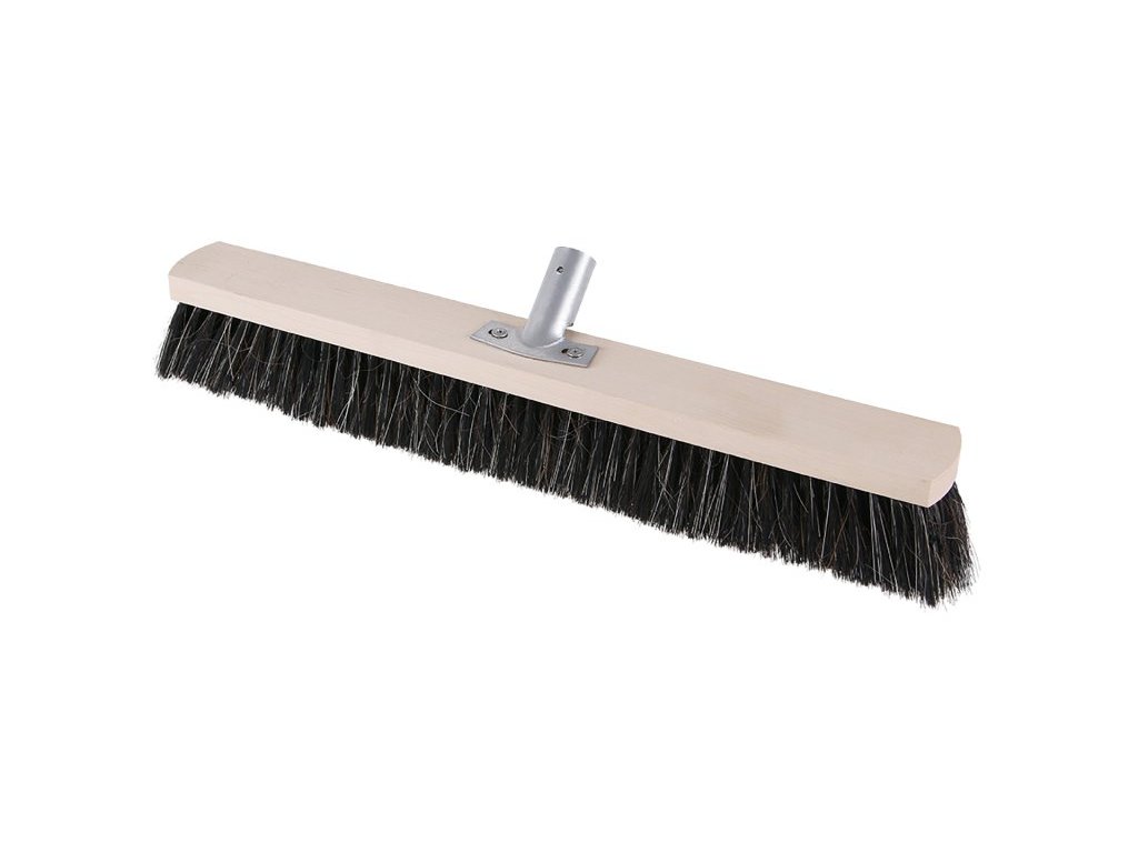 Klasický dřevěný sálový smeták s kovovým držákem pro násadu bez závitu. Vlákna z PET/žíně.