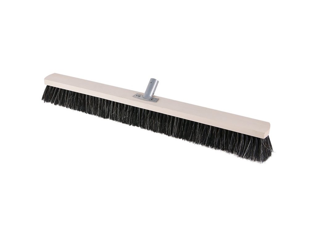 Klasický dřevěný sálový smeták s kovovým držákem pro násadu bez závitu. Vlákna z PET/žíně.