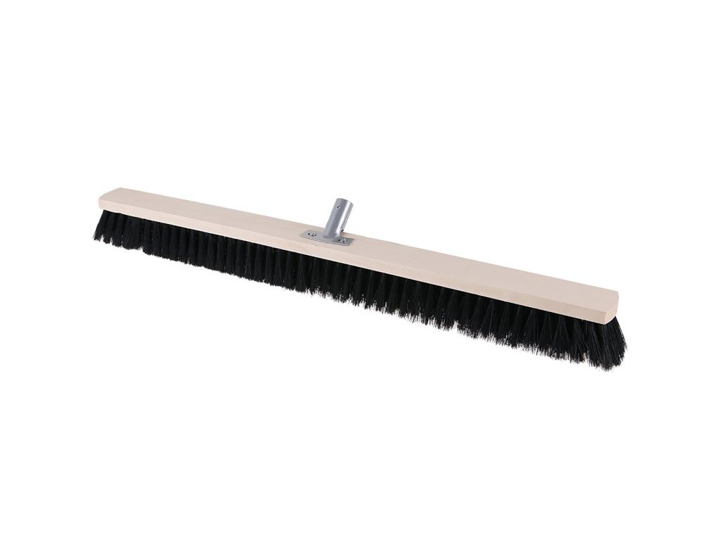 Klasický dřevěný sálový smeták s kovovým držákem pro násadu bez závitu. Vlákna z PET/žíně.