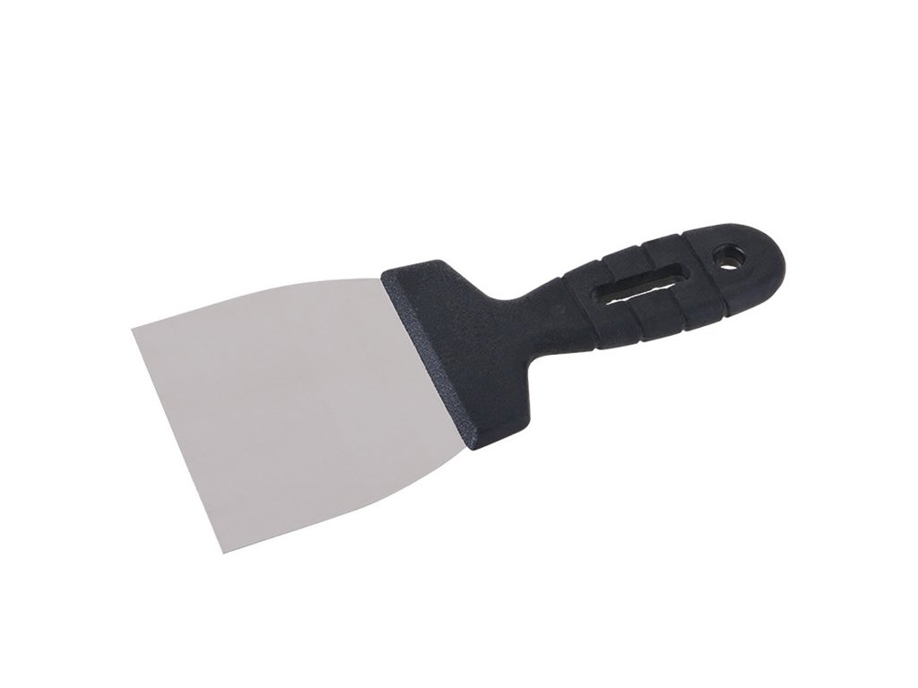 Špachtle škrábací nerezová 100 mm s plastovou ručkou. Je užíván ve štukatérství, malířství, natěračství, opravách karosérií nebo při umělecké tvorbě apod. Je vhodná k odstraňování staré malby a nátěrů.