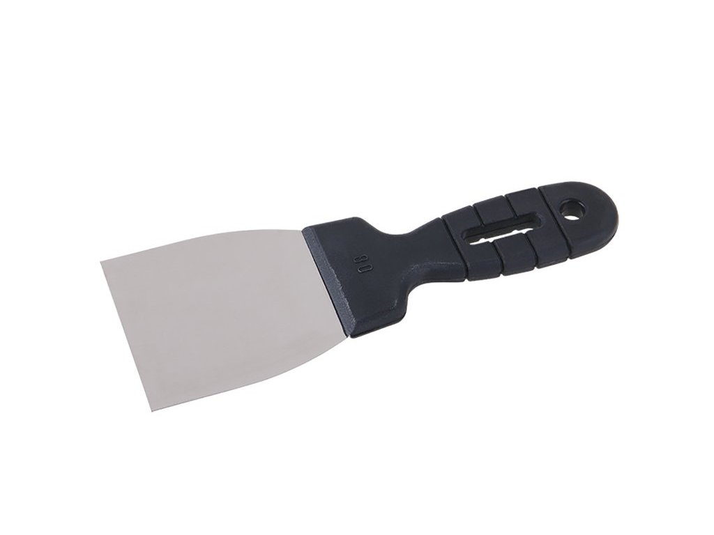 Špachtle škrábací nerezová 80 mm s plastovou ručkou. Je užíván ve štukatérství, malířství, natěračství, opravách karosérií nebo při umělecké tvorbě apod. Je vhodná k odstraňování staré malby a nátěrů.
