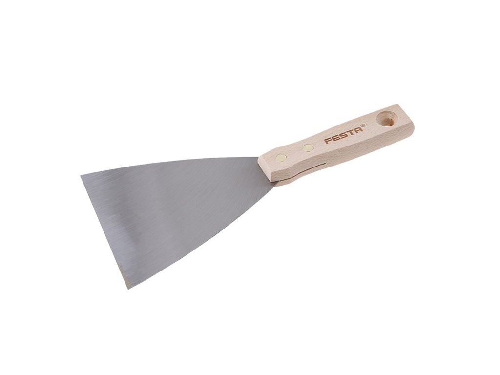 Malířská stěrka (špachtle) s broušeným ocelovým břitem a s dřevěnou nýtovanou rukojetí. Malířské stěrky se použivají pro zapravování děr, zeškrabavání přebytečného materiálu apod. Šířka břitu: 120mm