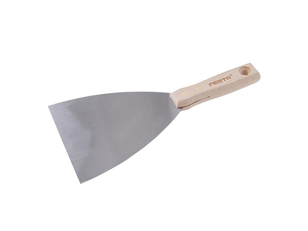Malířská stěrka (špachtle) s broušeným ocelovým břitem a s dřevěnou nýtovanou rukojetí. Malířské stěrky se použivají pro zapravování děr, zeškrabavání přebytečného materiálu apod. Šířka břitu: 140mm