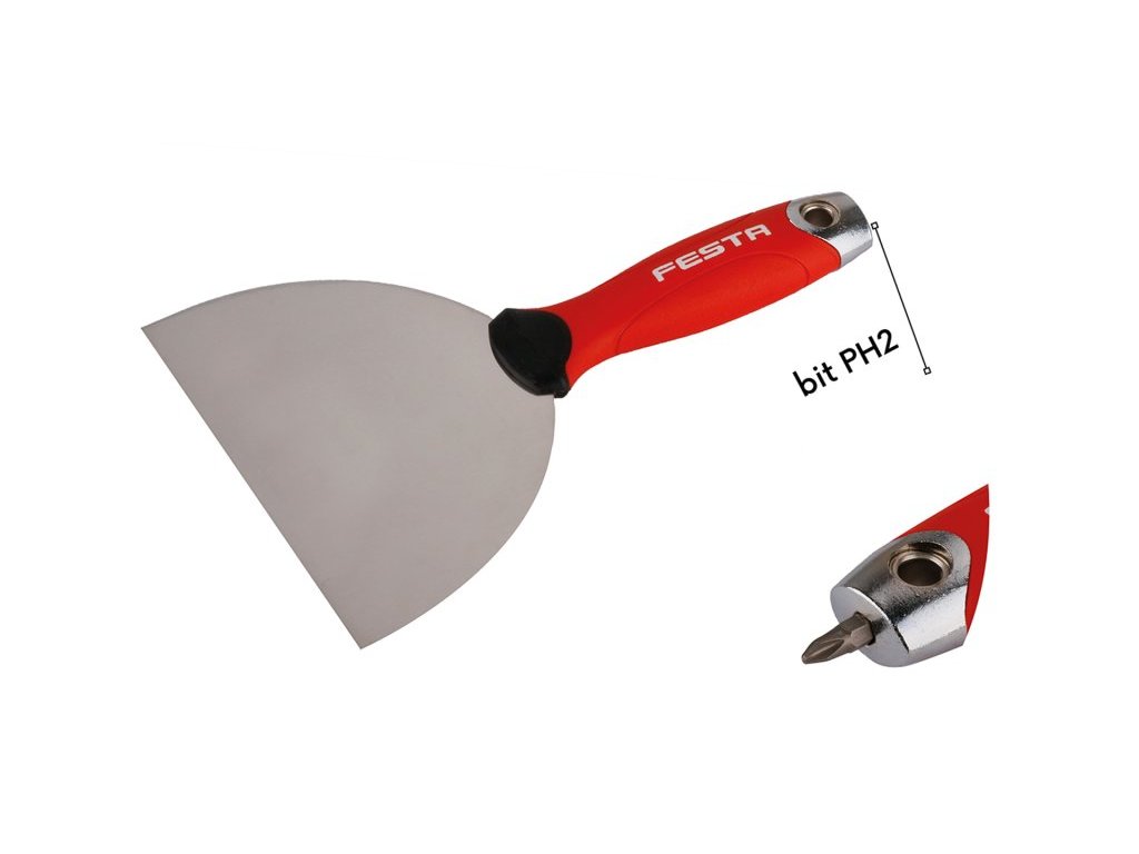 Špachtle s bitem nerezová FESTA 150 mm je vyrobena z vysoce kvalitní nerez oceli, rukojeť je ergonomický tvarovaná a pogumovaná. Používá se ve stavebnictví, zejména pak sádrokartonářském oboru a to pro perfektní zakrytí spojů sádrokartonových desek. V horní části rukojeti je umístěna vložka Ph °2, která se používá v případě, kdy je třeba dotáhnout vyčnívající šrouby z povrchu.