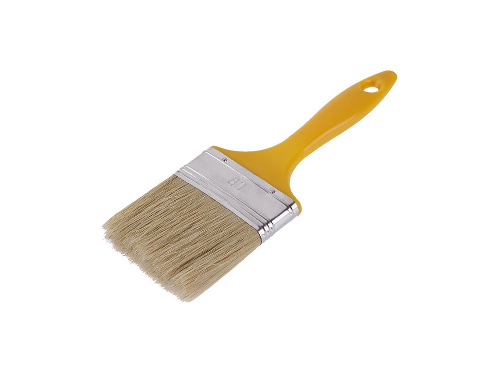 Štětec plochý 80x15x65mm se žlutým plastovým držadlem, světlá štětina - tato štětina se získává z čínských prasat v barevném provedení světlá, černá a šedá. Hmotnost 0,108 kg.