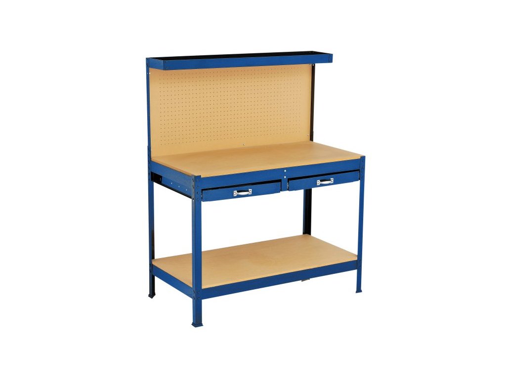 kvalitní kovový pracovní stůl - vhodný do malých dílen, garáží, sklepů konstrukce rámu z kovového plechu s práškovým lakem proti korozi dvě praktické zásuvky s vodícími lištami lehký chod výsuvu sololitová odolná pracovní deska i spodní odkládací deska zadní stěna s otvory pro upevnění háčků a zavěšení nářadí s praktickou horní odkládací plochou rozměry: výška celková 150 cm výška pracovní desky 90 cm výška dolní odkládací plochy 50 cm šířka 121 cm hloubka 61 cm