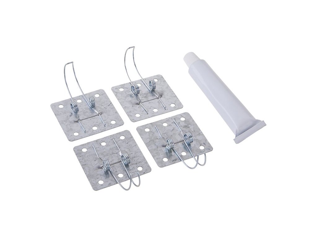 Svorky foxační - sada včetně silikonu, set svorek s pružnými pérky pro skryté prostory ve stavebnictví - zejména v kombinaci s obklady popř. sádrokartony, jako nenápadně ukryté přístupy k sifonům, uzávěrům, a jiným místům s nutností občasného přístupu, snadná aplikace silikonem nebo jiným lepidlem na kov, balení : blistr s eurootvorem.