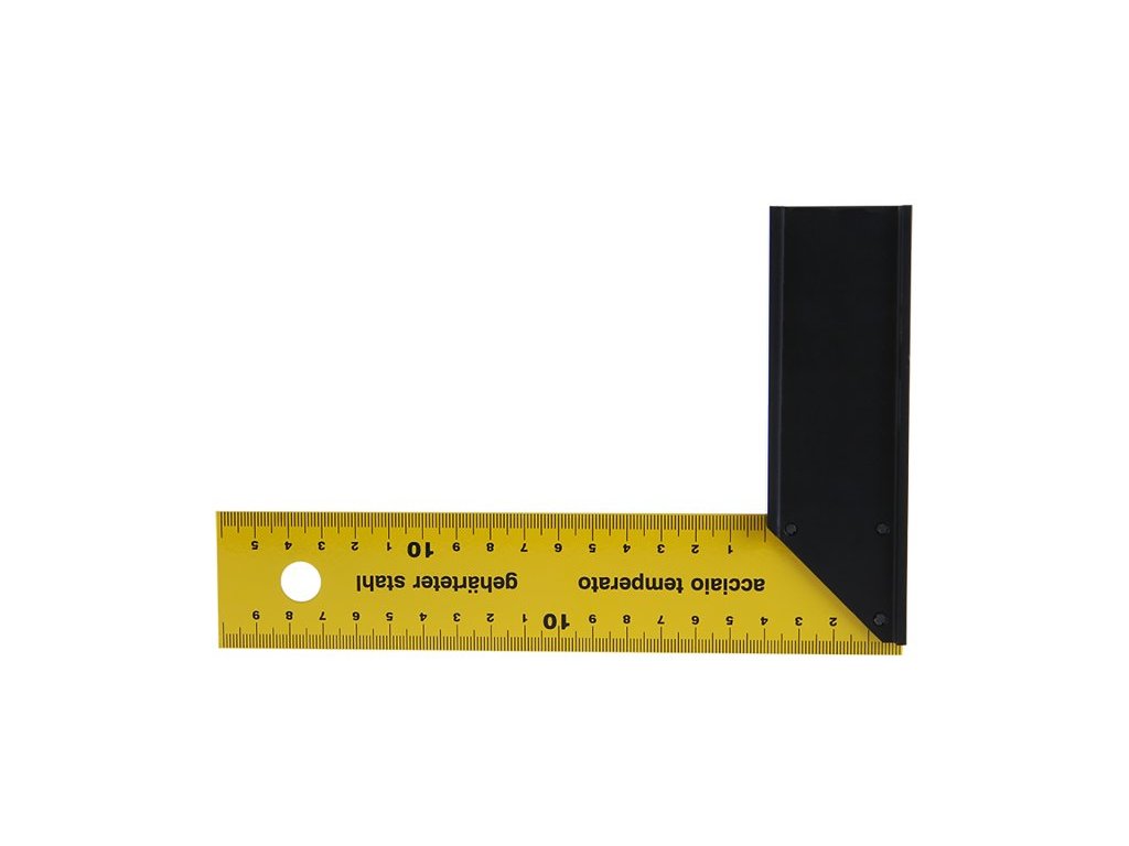 Truhlářský úhelník kvalitní zpracování a materiály ( tvrzená pružinová ocel, opěrné rameno z černě eloxovaného hliníku), stupnice v mm, přesnost 0,5mm/m.