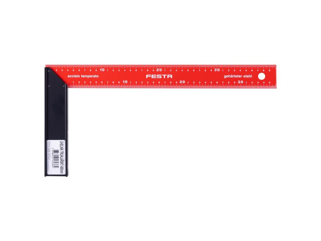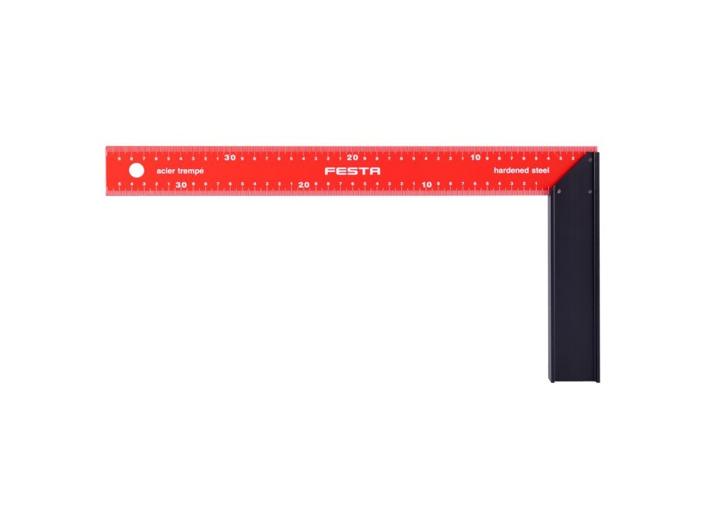 Truhlářský úhelník, kvalitní zpracování a materiály ( tvrzená pružinová ocel, opěrné rameno z černě eloxovaného hliníku), stupnice v mm, přesnost 0,5mm/m.