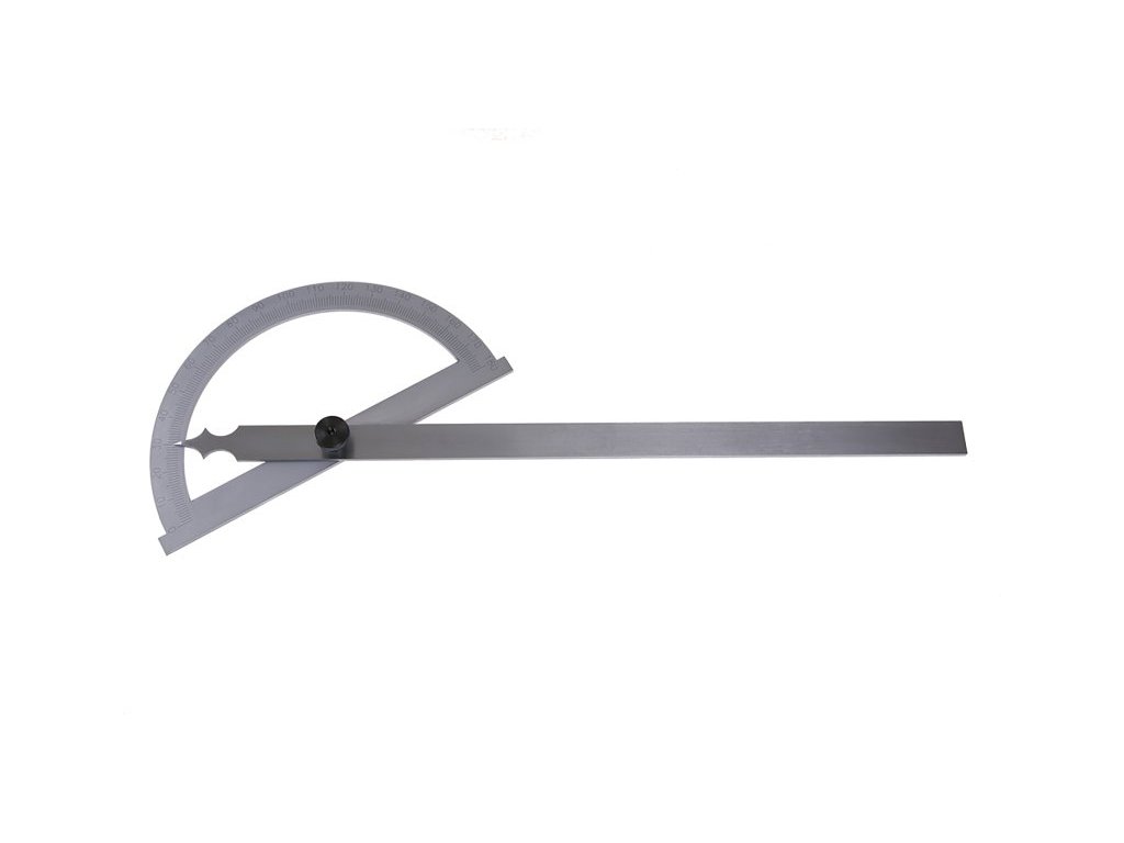 Úhloměr s otočným ramenem, délka základny úhelníku 300mm, délka otočného ramene 500mm, 0 - 180°, možnost aretace naměřeného úhlu pro přenesení. Nerezová ocel, koženkové pouzdro.