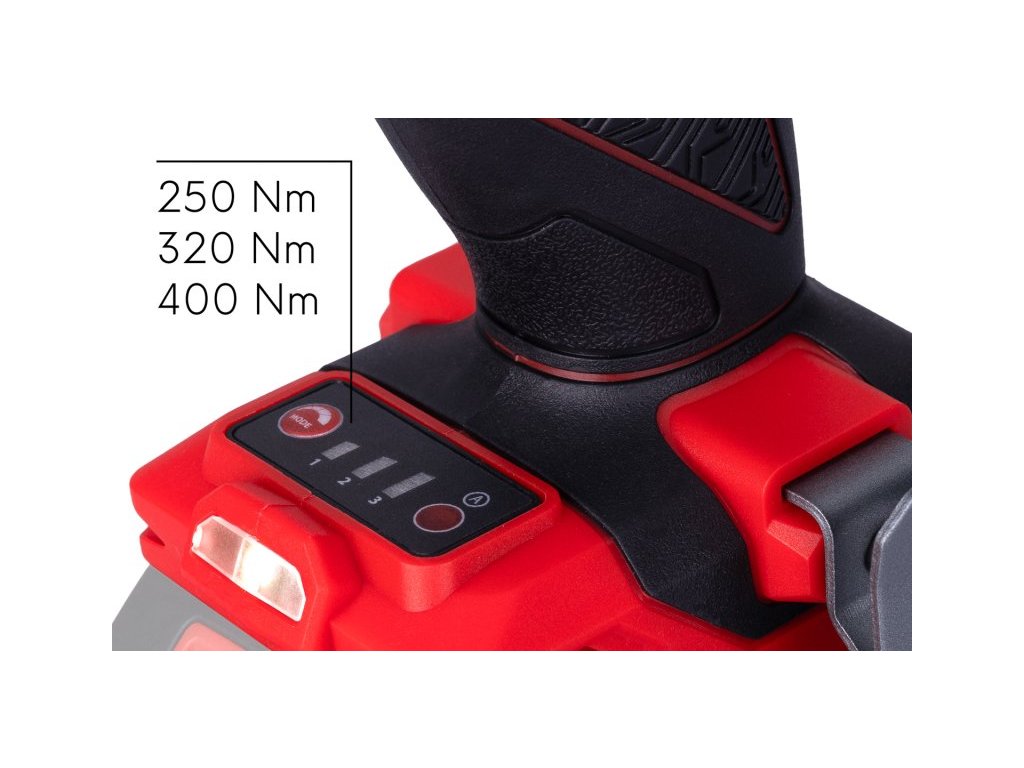 tři úrovně nastavení momentu 1 - 250 Nm, 2- 320 Nm, 3 - 400 Nm,otáčky 0 - 2800 min -1, hlava čtyřhran 1/2", hmotnost bez baterie 1.2kg