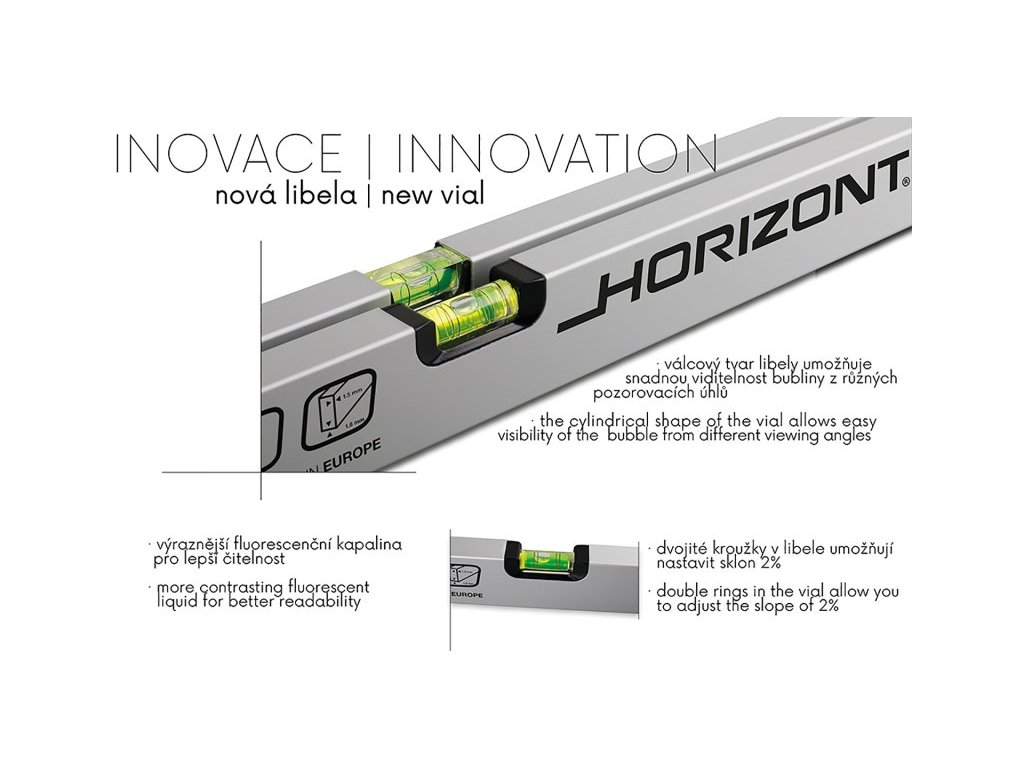 inovovaná horizontální válcová libela - snadná viditelnost ze všech úhlů pohledu dvojité kroužky v libele - vnější kroužky pro sklon 2% výraznější fluorescenční kapalina pro lepší viditelnost bubliny na slunci i v horších světelných podmínkách vodováha se dvěma libelami přesnost 0,5mm/m = 0,0285° tloušťka stěny ALU profilu 1,5 mm, eloxovaný otěruvzdorný povrch magnetické provedení - silné magnety, pro práci v zámečnictví, usazování kovových zárubní, atd. vodováha je odolná proti provozním nárazům 10 let záruka na libely, KAŽDÝ KUS ELEKTRONICKY TESTOVÁN