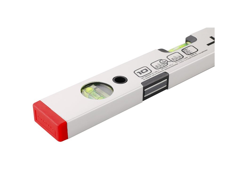 inovovaná horizontální válcová libela - snadná viditelnost ze všech úhlů pohledu dvojité kroužky v libele - vnější kroužky pro sklon 2% výraznější fluorescenční kapalina pro lepší viditelnost bubliny na slunci i v horších světelných podmínkách vodováha se dvěma libelami přesnost 0,5mm/m = 0,0285° tloušťka stěny ALU profilu 1,5 mm, eloxovaný otěruvzdorný povrch magnetické provedení - silné magnety, pro práci v zámečnictví, usazování kovových zárubní, atd. vodováha je odolná proti provozním nárazům 10 let záruka na libely, KAŽDÝ KUS ELEKTRONICKY TESTOVÁN