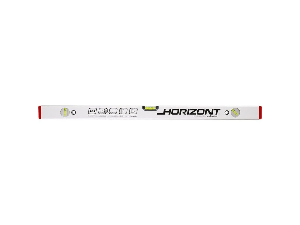 Horizont vodováha se třemi libelami, přesnost 0,5mm/m = 0,0285°, eloxovaný otěruvzdorný povrch, tloušťka stěny ALU profilu 1,5mm, kapalina v libelách je UV stabilizovaná a fluorescenční, horizontální optická libela - usnadňuje a zvyšuje přesnost měření, vodováha je odolná proti provozním nárazům, 10 let záruka na libely, KAŽDÝ KUS ELEKTRONICKY TESTOVÁN.