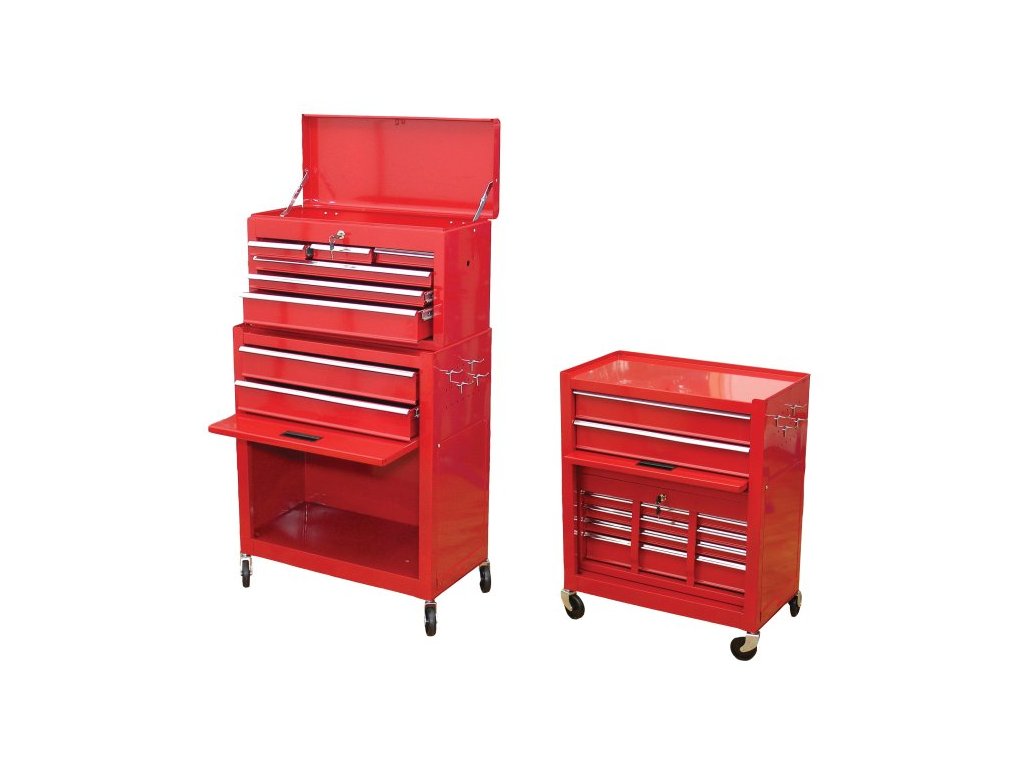 Montážní vozík vysoký skládající se ze dvou částí, horní skříňku lze uložit do spodního vozíku. HORNÍ BOX: Celkové rozměry: 600x260x340mm 3x nízká zásuvka: 151,5x225x40mm 2x široká nízká zásuvka: 511x225x40mm 1x vysoká zásuvka: 511x225x85mm Hmotnost 11,2kg, UZAMYKATELNÝ. SPODNÍ BOX: Celkové rozměry: bez koleček 616x330x658mm, s kolečky 616x330x742mm 2x zásuvka: 511x308x85mm úložná část: 536x300x378mm OTOČNÁ KOLEČKA: průměr 76,2mm šířka 25,4mm