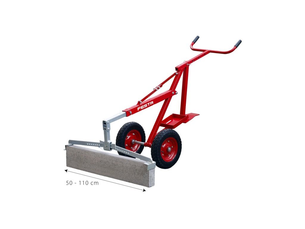 konstrukce vozíku s dlouhpu pákou a velkými řidítky umožňuje lehkou manipulaci 1 osoby s těžkými obrubníky