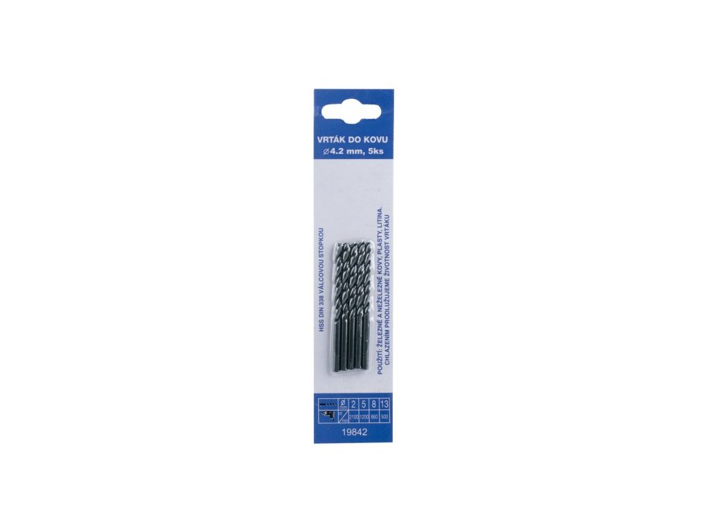 Vrták HSS DIN 338, RN, je vyrobený z kvalitní rychlořezné oceli (HSS). Přesné vyrobená šroubovice pro kvalitní výkon, přesnost a dobré středění, vybroušení úhlu špičky vrtáku 118°, pro vrtání běžné konstrukční oceli, baleno na kartách pro snadné zavěšení na prodejní stojany.