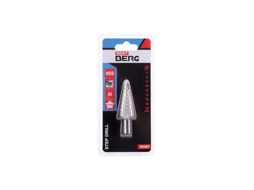 stupňovitý vrták z kvalitní HSS oceli DIN 1412C pro vrtání slitin a ocelových plátů do tloušťky 4 mm, plastu a dřeva, široké drážky snadno odvedou odvrtaný materiál 9 stupňů, 4, 6, 8, 10, 12, 14, 16, 18, 20 mm Instruktážní video