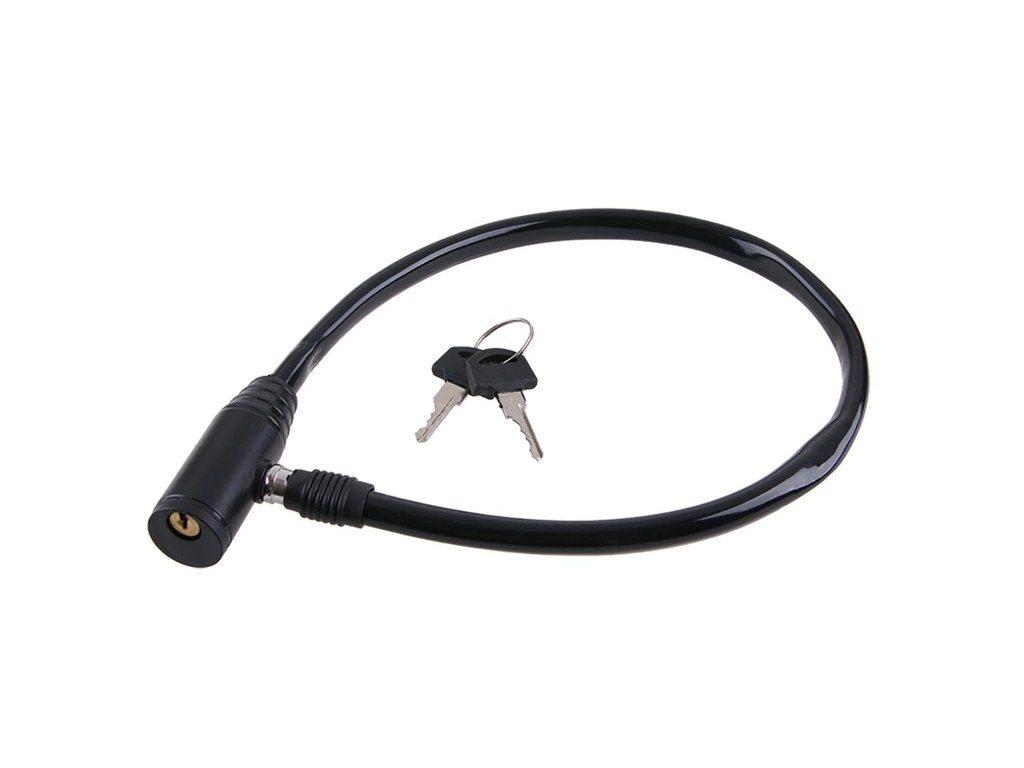 55 cm spirálové lanko z kvalitní oceli Ochranný plášt z PVC Průměr: 8mm Klíče: 2 Váha: 100g.