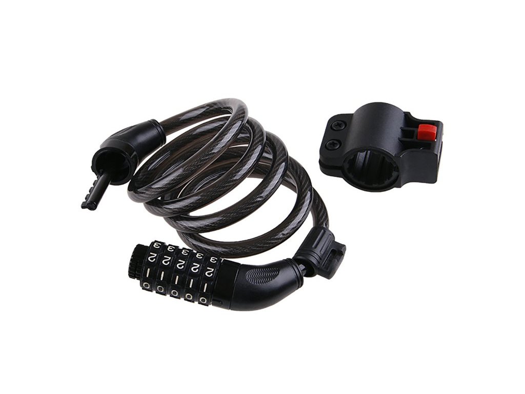 Snadno přenosný. Zamykání na kód pomocí kombinace 5 čísel. Snadno připevnitelný ke kolu díky klipu na sedlovku. Materiál: flexibilní vinuté ocelové lanko potažené vinylem.