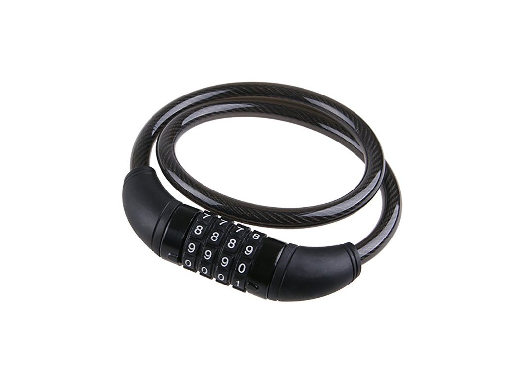 Snadno přenosný. Zamykání na kód pomocí kombinace 4 čísel. Snadno připevnitelný ke kolu pro přepravu. Materiál: flexibilní vinuté ocelové lanko potažené vinylem.