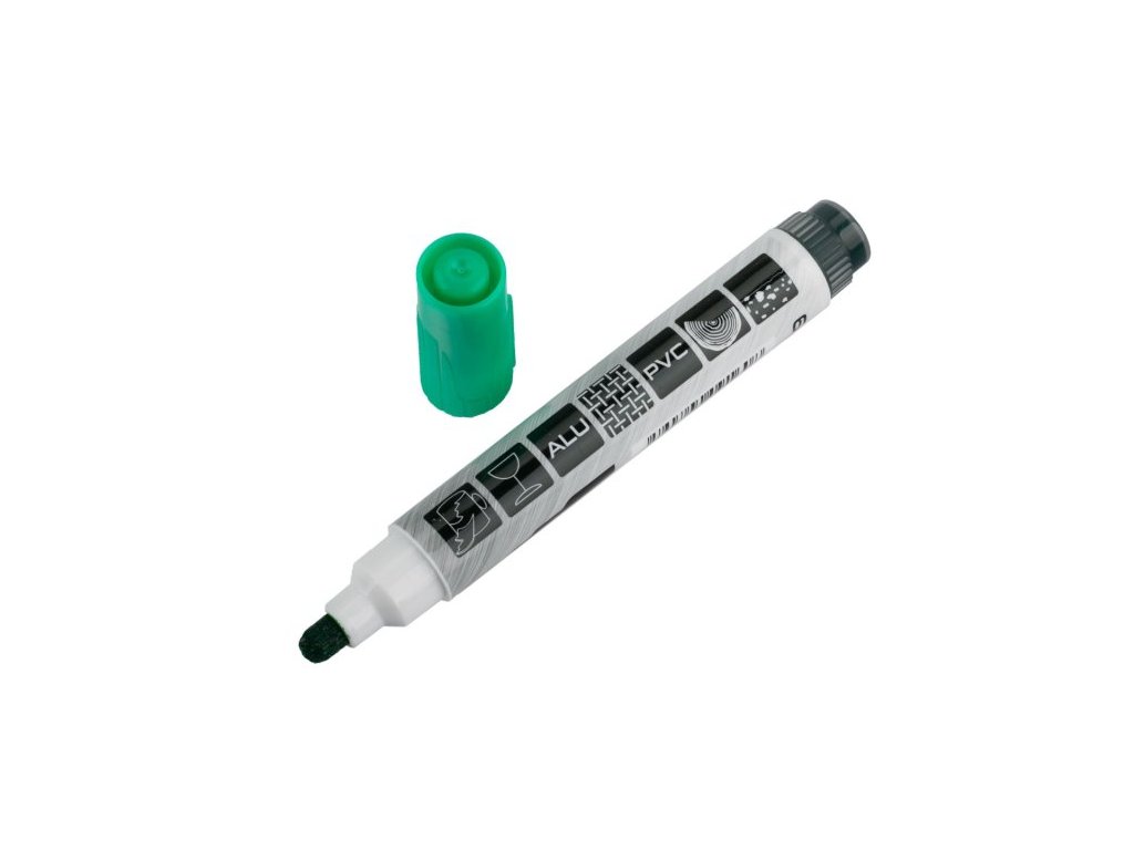 vhodný pro popisy železných konstrukcí, skla, plastů, černých strečových folií atd..